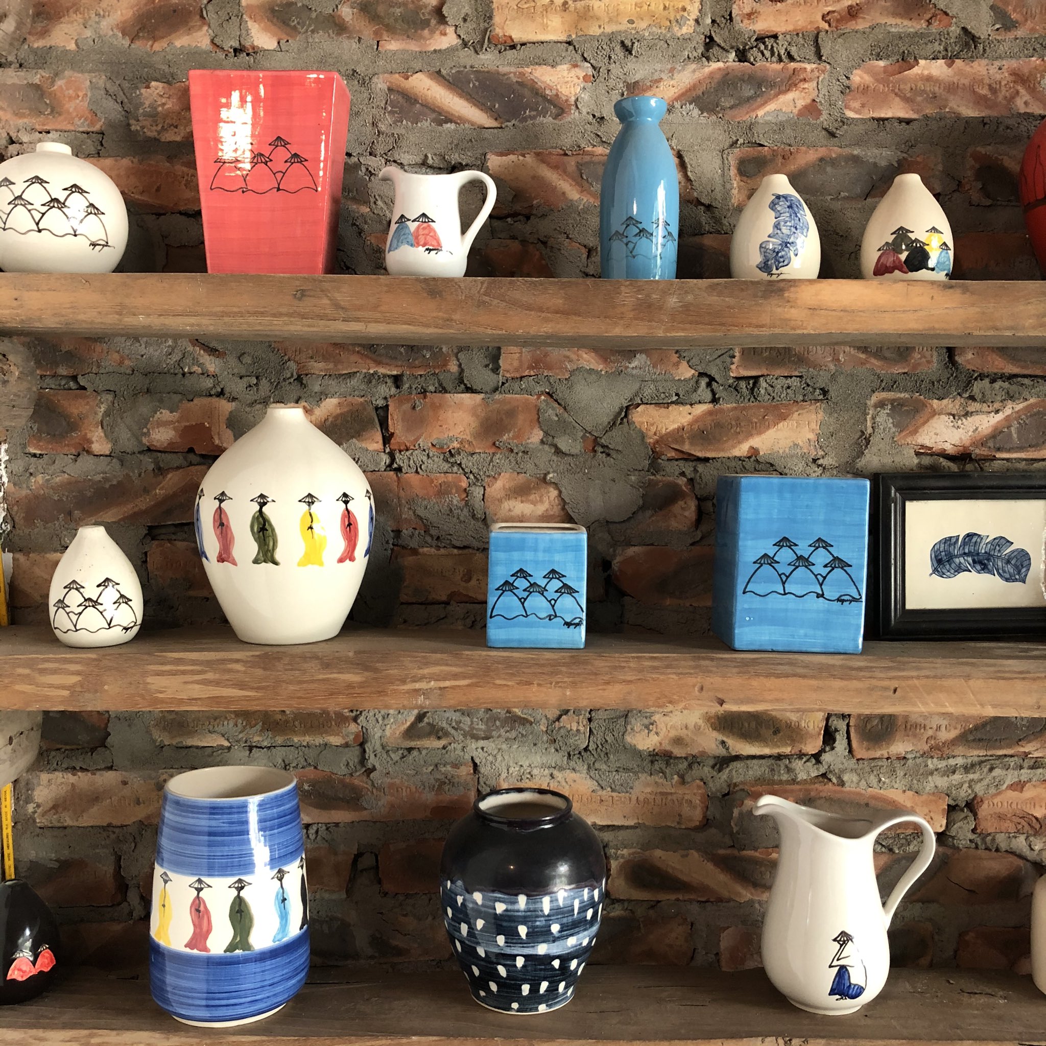 バッチャン村にあるグエンさんのアトリエ兼ショップは一軒家で、通りの奥の方にあります。他の販売店は、お皿が無尽蔵に積み上げられたようなお店が多いですが、それらとは一線を介すアートギャラリーのようなお店です。