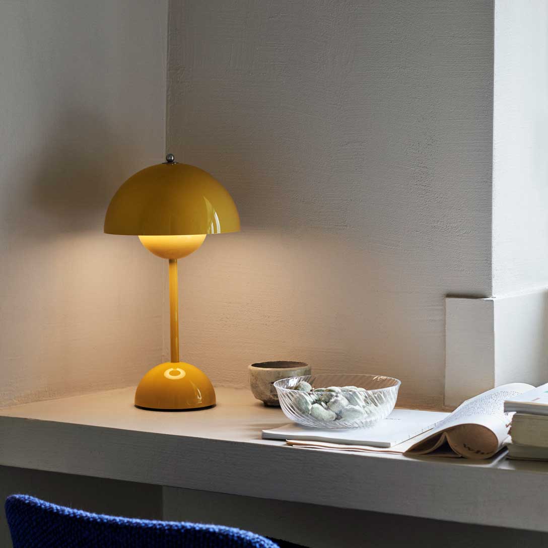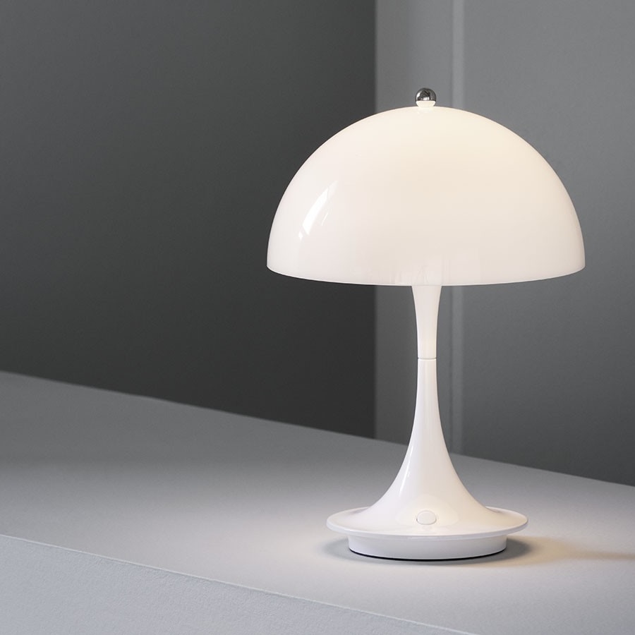 1971年にヴェルナー・パントンが生み出したオリジナルのパンテラが持つ、有機的で流れるようなフォルムをコンパクトサイズに落とし込んだのが、このポータブルタイプのモデルです。最新のV3では全13〜15色もの豊富なカラーバリエーションがラインナップされており、オパール系の透過する光色から不透明でアクセントになるビビッドカラー、真鍮メタライズドやクローム仕上げのものまで、幅広い種類から選ぶことができます。