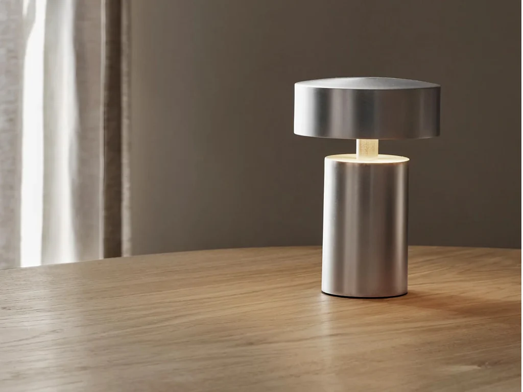 Column(カラム)は、デンマークのブランド「Audo Copenhagen(オード・コペンハーゲン)」によるポータブルテーブルライト。建築的な円柱フォルムと、装飾を極力そぎ落としたミニマルなデザインが特徴です。金属製のボディはマットで落ち着いた質感に仕上げられており、光を透過させるのではなく、下方向を中心にやさしく照らします。