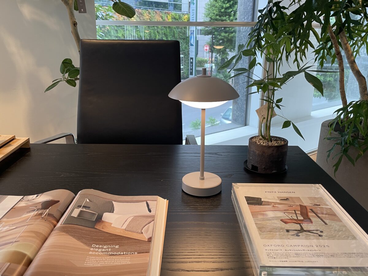 フリッツ・ハンセン東京(FRITZ HANSEN TOKYO)は、外苑前西通り沿いに構えるフラッグシップショップ。家具とともに照明も丁寧に展示されており、「CLAM Portable Lamp」は3色すべて実物を確認することができました。マットな質感や、光が透過しないシェードならではの落ち着いた光の広がりは、ぜひ実店舗で体感したいポイントです。