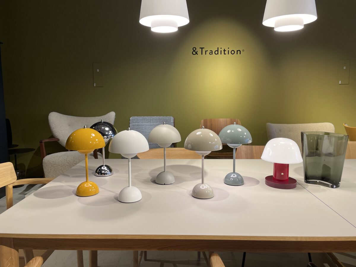 &Traditionの東京ショールームは、渋谷駅と表参道駅の間、青山学院大学のすぐ隣という分かりやすい立地にあります。246号線沿いに位置し、「Flowerpot VP9」や「Raku SH8」をはじめ、さまざまなポータブルライトが展示されています。カラー展開やサイズ感をまとめて比較できるため、&Traditionの照明を検討する際には一度足を運びたい場所です。