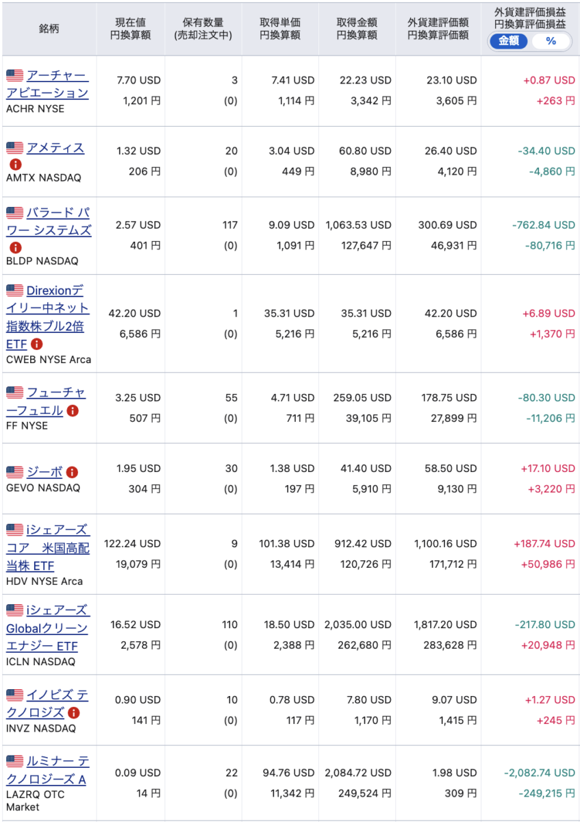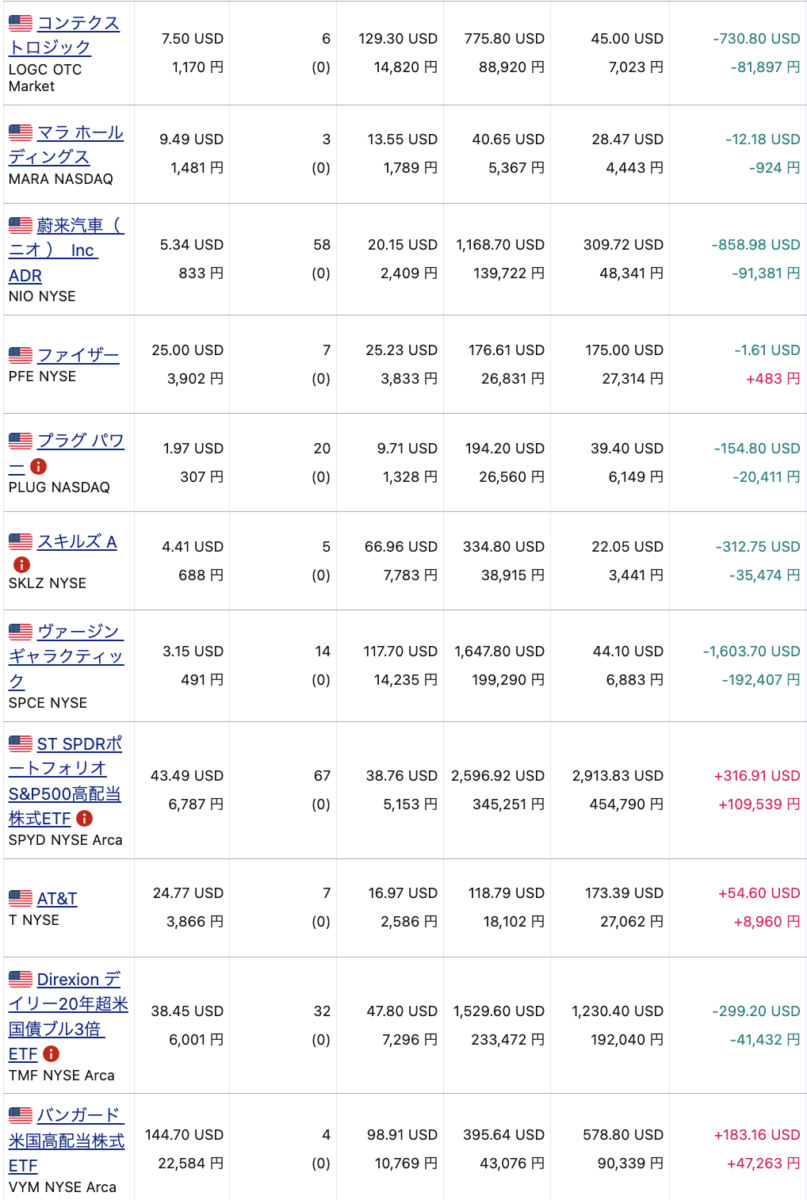 評価損益は、ドルでは-6,383.56 USD、円換算で-566,646円。少しマイナスが減りましたが、プラ転までの道のりはまだまだ長そうです。