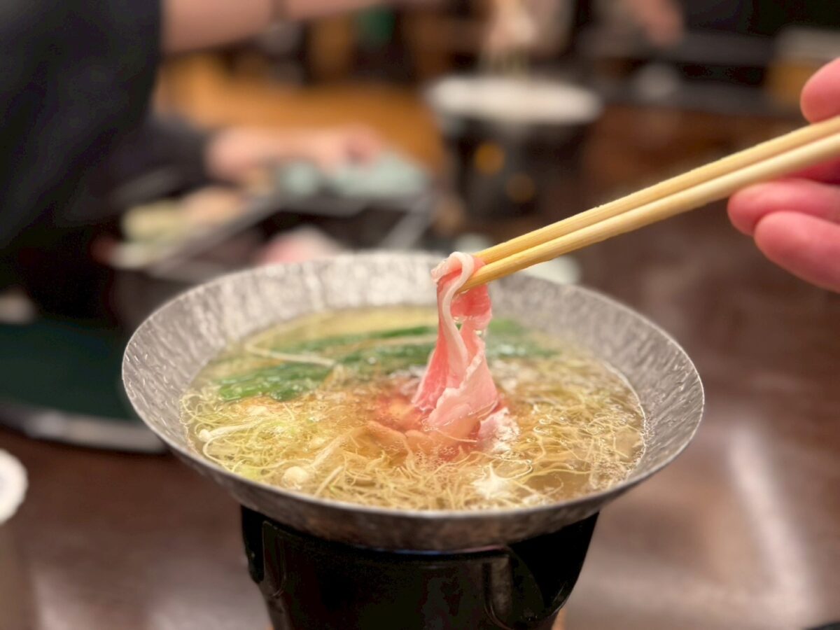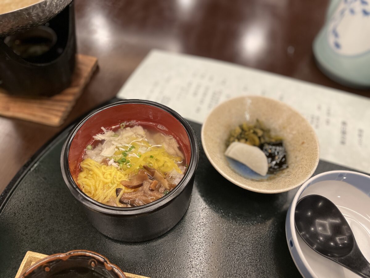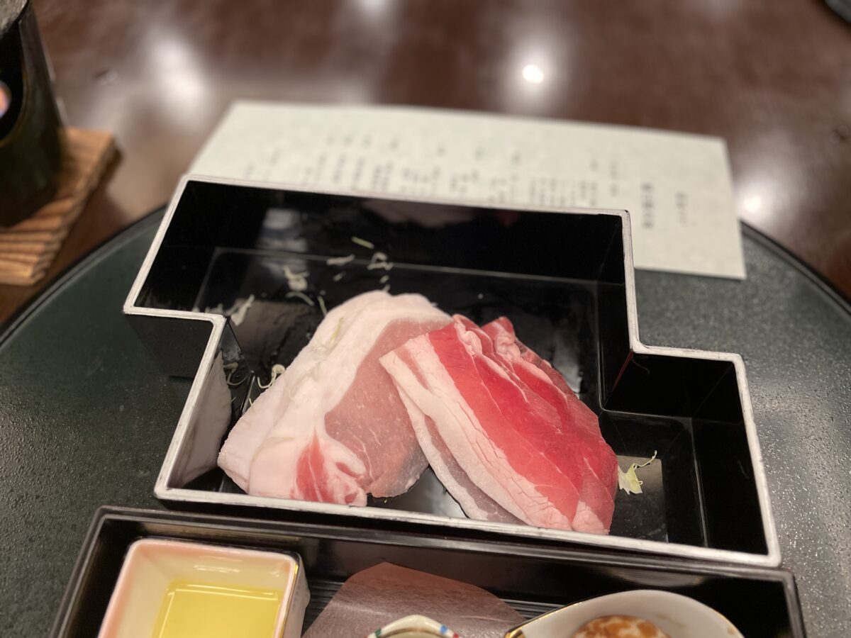夕食は、鹿児島産黒豚のしゃぶしゃぶを中心に、旬な魚のお造りや、鹿児島郷土料理の鶏飯など全10品の『薩摩創作和会席』。黒豚はやわらかく旨みがあり、野菜と豚肉の風味が滲み出た出汁も美味しかったです。締めの鶏飯まで含めて、全体的に満足度の高い夕食でした。